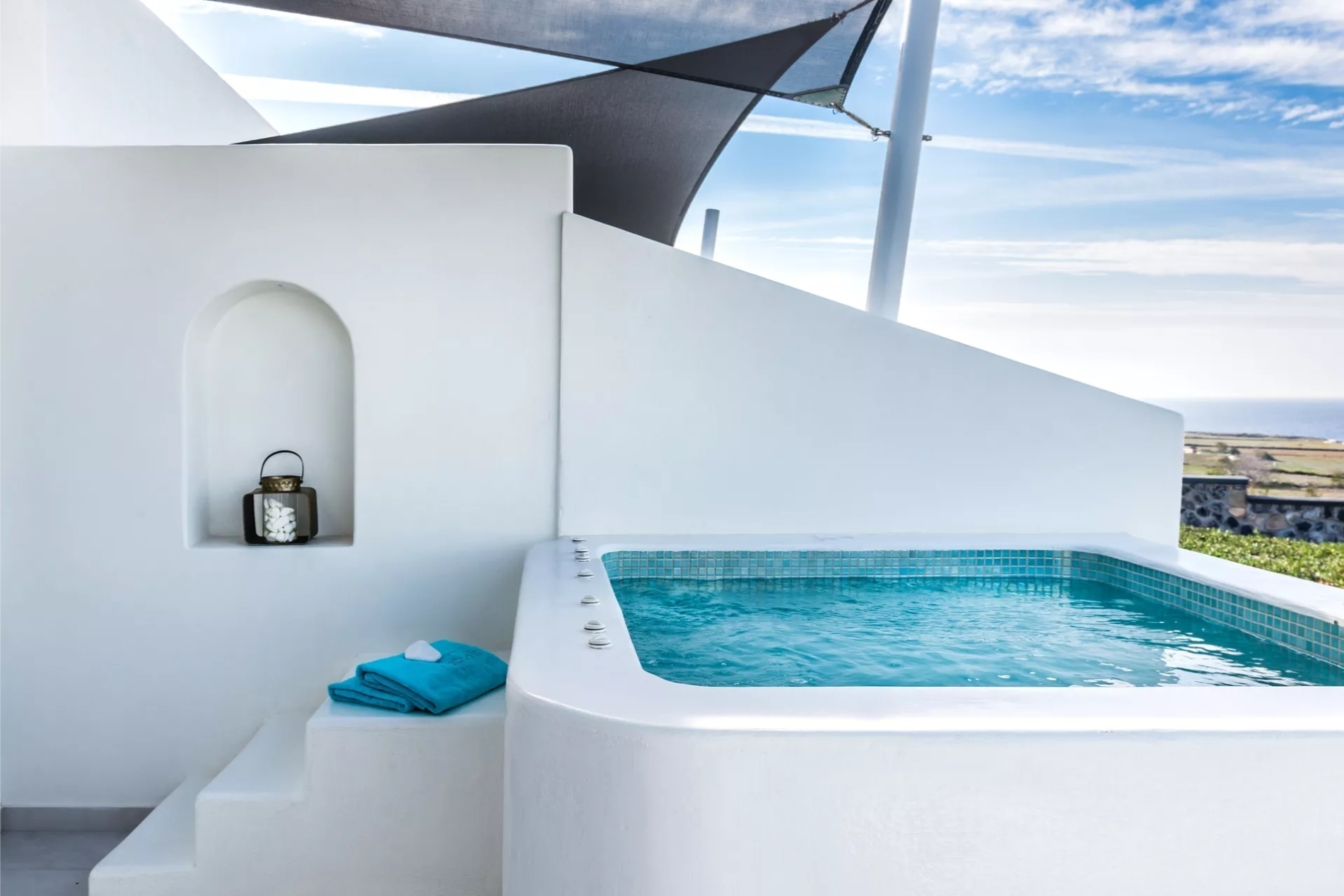 Escape to the Junior Suite with Outdoor Hot Tub & Sea View, where comfort meets breathtaking scenery. Designed to offer guests moments of relaxation, this suite features a private outdoor jacuzzi—perfect for unwinding while soaking in the stunning vistas of Oia. Spanning 28 sqm (301 sqft), the suite is equipped with modern comforts, including a king-size Serta pillow-top mattress, ensuring a restful sleep that energizes you for another day of adventure. Myst’s elegant blend of Cycladic architecture and modern design creates a stylish retreat, offering the perfect balance of convenience and charm for your Santorini getaway.